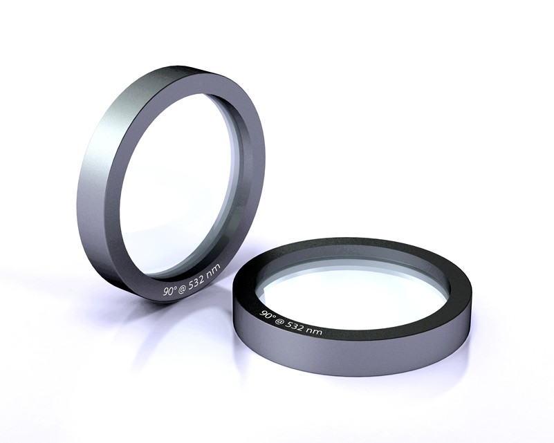 Polarization rotator is a good alternative to retardation waveplate when it comes to rotation of polarization at certain angle. Polarization rotation is caused by property, called Optical activity, which is natural to quartz crystal and other substances that are enantiomorphous. This property is caused by crystal lattice structure, that lacks mirror symmetry due to helicoidal chains of SiO4 units oriented along c-axis in quartz structure. Depending on chain rotation direction, there is “right” and “left” quartz which rotates polarization clockwise or counter-clockwise respectively. Polarization rotators are c-cut so rotation of polarization occurs independently of component’s rotation around optical axis, thus component is alignment-insensitive and the only requirement is that incident beam must be perpendicular to rotator’s aperture. Laserand offers rotators with fixed 45 deg or 90 deg rotation of polarization with antireflection coatings for design wavelength. For convenient use all rotators are mounted in black anodized aluminum mount. Device is good replacement for waveplate, for usage along with narrow band lasers.